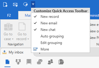 Customise the "Quick access" toolbar or ribbon by clicking on the down arrow icon in the upper left corner of the main, record, or case window. Select More at the bottom of the drop-down menu. The "Customise toolbar and ribbon" window opens, displaying the ribbon functions of the window you are currently in, i.e., main, record, or case window. At the top of the window, you can select which of the window’s tabs that you want to customise.